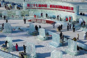 (260102) -- HARBIN, 2 enero, 2026 (Xinhua) -- Vista aérea tomada con un dron de competidores trabajando en esculturas de...