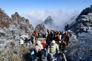 (260102) -- BEIJING, 2 enero, 2026 (Xinhua) -- Turistas visitan el área escénica de la montaña Huangshan tras una nevada,...