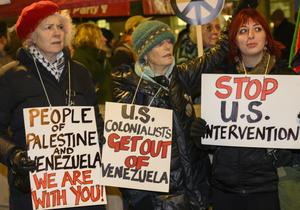 (260106) -- TOKIO, 6 enero, 2026 (Xinhua) -- Personas sostienen un cartel en apoyo a Venezuela durante una protesta frente...