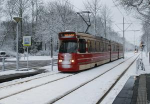 (260107) -- LA HAYA, 7 enero, 2026 (Xinhua) -- Un tranvía circula por las vías cubiertas de nieve, en La...