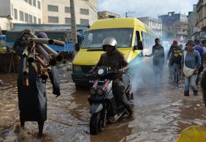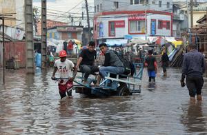 (260107) -- ANTANANARIVO, 7 enero, 2026 (Xinhua) -- Personas cruzan una calle inundada en un barrio, en Antananarivo, capital de...