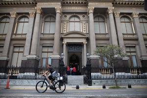 (260107) -- BUENOS AIRES, 7 enero, 2026 (Xinhua) -- Un hombre circula en una bicicleta frente a la sede del...