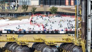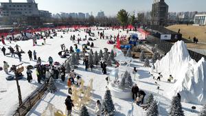 (260109) -- HANGZHOU, 9 enero, 2026 (Xinhua) -- Personas se divierten en un carnaval de hielo y nieve, en Hangzhou,...