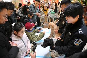 (260110) -- BEIJING, 10 enero, 2026 (Xinhua) -- Ciudadanos interactúan con cachorros de perros policía, en Qingdao, en la provincia...