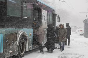 (260110) -- VLADIVOSTOK, 10 enero, 2026 (Xinhua) -- Personas suben a un autobús en medio de una ventisca, en Vladivostok,...