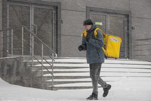 (260110) -- VLADIVOSTOK, 10 enero, 2026 (Xinhua) -- Un repartidor camina bajo una ventisca, en Vladivostok, Rusia, el 10 de...