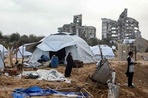 (260109) -- GAZA, 9 enero, 2026 (Xinhua) -- Palestinos inspeccionan los daños causados por un ataque israelí contra un campamento...