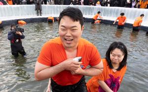 (260110) -- HWACHEON, 10 enero, 2026 (Xinhua) -- Un hombre atrapa peces con las manos desnudas durante el Festival de...