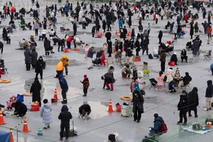 (260110) -- HWACHEON, 10 enero, 2026 (Xinhua) -- Turistas pescan en un río congelado durante el Festival de Hielo Sancheoneo...