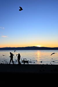 (260112) -- OHRID, 12 enero, 2026 (Xinhua) -- Personas caminan por la orilla del Lago Ohrid durante el atardecer, en...