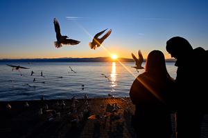 (260112) -- OHRID, 12 enero, 2026 (Xinhua) -- Personas disfrutan del atardecer junto al Lago Ohrid, en Ohrid, Macedonia del...
