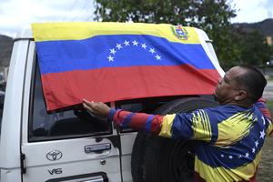 (260113) -- CARACAS, 13 enero, 2026 (Xinhua) -- Un hombre coloca una bandera nacional venezolana en un automóvil durante una...