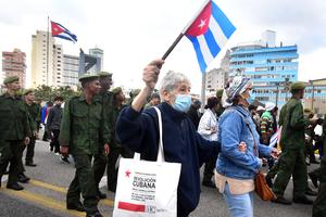 (260116) - LA HABANA, 16 enero, 2026 (Xinhua) -- Una ciudadana porta una bandera cubana mientras participa en una marcha frente...