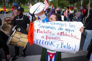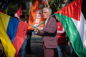(260116) -- BOGOTA, 16 enero, 2026 (Xinhua) -- Imagen del 15 de enero de 2026 de un hombre sosteniendo banderas...