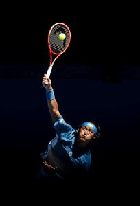 (260118) -- MELBOURNE, 18 enero, 2026 (Xinhua) -- Zhang Zhizhen, de China, sirve la pelota durante el partido de individuales...