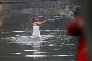 (260118) -- KATMANDU, 18 enero, 2026 (Xinhua) -- Un devoto realiza un ritual en el río Bagmati durante el Festival...