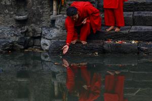 (260118) -- KATMANDU, 18 enero, 2026 (Xinhua) -- Una devota realiza un ritual durante el Festival de Madhav Narayan, de...