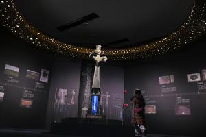 (260118) -- BEIJING, 18 enero, 2026 (Xinhua) -- Una visitante observa una réplica de una figura de bronce de pie...