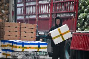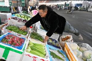 (260121) -- URUMQI, 21 enero, 2026 (Xinhua) -- Imagen del 19 de enero de 2026 de un vendedor acomodando verduras...