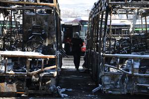 (260121) -- TEHERAN, 21 enero, 2026 (Xinhua) -- Una mujer permanece entre autobuses dañados durante los disturbios recientes, en Teherán,...