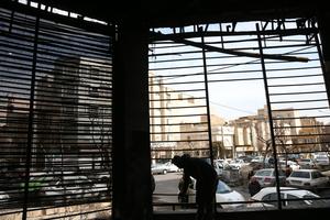 (260121) -- TEHERAN, 21 enero, 2026 (Xinhua) -- Un hombre permanece dentro del edificio de una sucursal bancaria dañada durante...