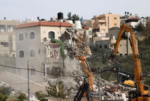 (260121) -- RAMALLAH, 21 enero, 2026 (Xinhua) -- Excavadoras israelíes demuelen una vivienda palestina, en la aldea de Shuqba, en...