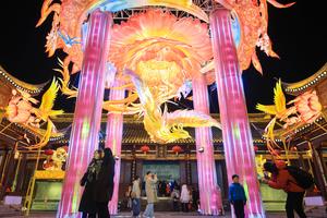 (260121) -- NANJING, 21 enero, 2026 (Xinhua) -- Turistas observan las decoraciones luminosas exhibidas en el área escénica del Templo...
