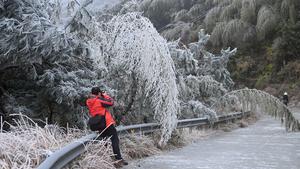 (260121) -- SANJIANG, 21 enero, 2026 (Xinhua) -- Un visitante toma fotografías de carámbanos, en el distrito autónomo dong de...
