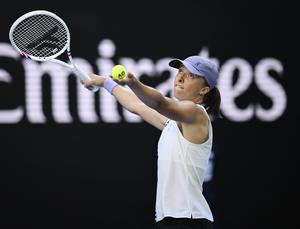 (260122) -- MELBOURNE, 22 enero, 2026 (Xinhua) -- Iga Swiatek, de Polonia, devuelve la pelota durante el partido de segunda...