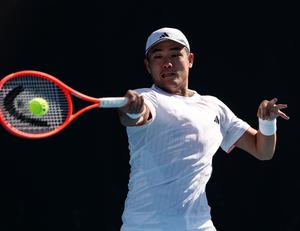 (260122) -- MELBOURNE, 22 enero, 2026 (Xinhua) -- Wu Yibing devuelve la pelota durante el partido de segunda ronda de...