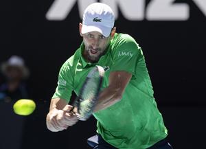 (260122) -- MELBOURNE, 22 enero, 2026 (Xinhua) -- Novak Djokovic devuelve la pelota durante el partido de segunda ronda de...
