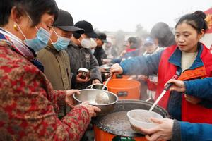 (260126) -- BEIJING, 26 enero, 2026 (Xinhua) -- Empleados de una empresa reparten gratis gachas de Laba a los aldeanos,...