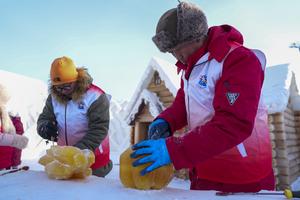 (260128) -- HARBIN, 28 enero, 2026 (Xinhua) -- Escultores tallan esculturas de hielo teñido con plantas en el Mundo de...