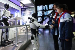 (260127) -- SHANGHAI, 27 enero, 2026 (Xinhua) -- Visitantes estrechan la mano con un robot en el Museo de Ciencia...