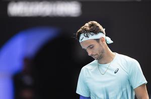 (260128) -- MELBOURNE, 28 enero, 2026 (Xinhua) -- Lorenzo Musetti, de Italia, reacciona durante el partido de cuartos de final...