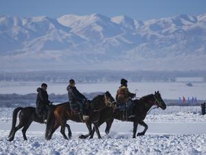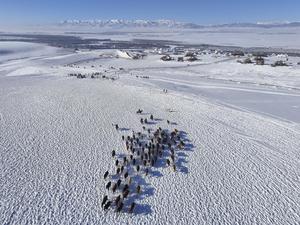 (260103) -- ZHAOSU, 3 enero, 2026 (Xinhua) -- Turistas montan a caballo bajo la guía de un pastor (d) en...