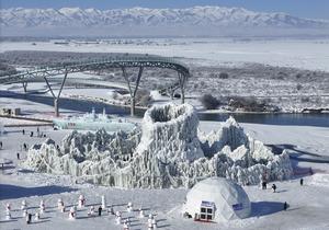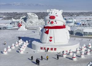 (260103) -- ZHAOSU, 3 enero, 2026 (Xinhua) -- Personas observan esculturas de hielo en un parque temático de hielo y...