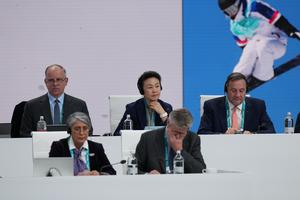 (260203) -- MILAN, 3 febrero, 2026 (Xinhua) -- Li Lingwei (c-atrás), miembro del Comité Ejecutivo del Comité Olímpico Internacional (COI),...