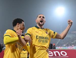 (260204) -- BOLONIA, 4 febrero, 2026 (Xinhua) -- Imagen del 3 de febrero de 2026 de Adrien Rabiot (d), de AC Milan, festejando su anotación con su compañero Zachary Athekame durante un partido de fútbol de la Serie A entre Bologna y AC Milan, en Bolonia, Italia. (Xinhua/Alberto Lingria) (ah) (ra) (vf)