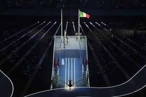 (260206) — MILAN, 6 febrero, 2026 (Xinhua) — Una ceremonia de izamiento de bandera se lleva a cabo durante la ceremonia de inauguración de los Juegos Olímpicos de Invierno Milán-Cortina 2026 en el Estadio Olímpico San Siro, en Milán, Italia, el 6 de febrero de 2026. (Xinhua/Zhang Haofu) (rtg) (ra) (vf)