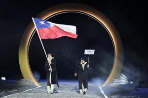 (260207) — PREDAZZO, 7 febrero, 2026 (Xinhua) — Imagen del 6 de febrero de 2026 de la delegación de Chile desfilando hacia el Estadio de Saltos de Esquí de Predazzo durante la ceremonia de inauguración de los Juegos Olímpicos de Invierno Milán-Cortina 2026, en Predazzo, Italia. (Xinhua/Huang Wei) (oa) (da)
