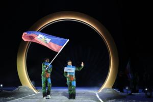 (260207) — PREDAZZO, 7 febrero, 2026 (Xinhua) — Imagen del 6 de febrero de 2026 de la delegación de Haití desfilando hacia el Estadio de Saltos de Esquí de Predazzo durante la ceremonia de inauguración de los Juegos Olímpicos de Invierno Milán-Cortina 2026, en Predazzo, Italia. (Xinhua/Huang Wei) (oa) (da)