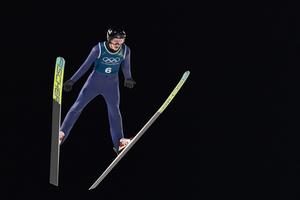 (260209) -- PREDAZZO, 9 febrero, 2026 (Xinhua) -- Imagen del 8 de febrero de 2026 de Nikaido Ren, de Japón, compitiendo durante el segundo Entrenamiento Oficial de trampolín normal masculino de salto de esquí en los Juegos Olímpicos de Invierno Milán-Cortina 2026, en Predazzo, Italia. (Xinhua/Huang Wei) (oa) (vf)