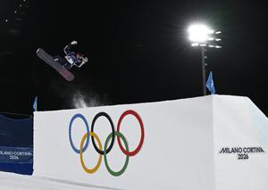 (260208) — LIVIGNO, 8 febrero, 2026 (Xinhua) — Imagen del 7 de febrero de 2026 de Lyon Farrell, de Nueva Zelanda, compitiendo durante la final de Big Air masculino de Snowboard en los Juegos Olímpicos de Invierno Milán-Cortina 2026, en Livigno, Italia. (Xinhua/Xia Yifang) (rtg) (ah)