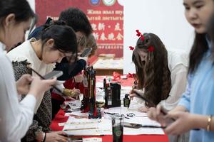 (260213) -- ALMATY, 13 febrero, 2026 (Xinhua) -- Estudiantes del Instituto Confucio de la Universidad Nacional Kazaja Al-Farabi practican caligrafía china durante un evento cultural del Año Nuevo chino, en Almaty, Kazajistán, el 13 de febrero de 2026. (Xinhua/Li Renzi) (jg) (da) (vf)