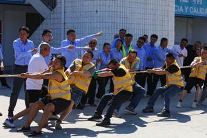 (260219) -- LA LIBERTAD, 19 febrero, 2026 (Xinhua) -- Imagen del 16 de febrero de 2026 de trabajadores de la empresa constructora China State Construction recibiendo un premio tras ganar el juego de "tira y afloja" durante la celebración del Año Nuevo chino, en el sitio de construcción del proyecto del Estadio Nacional de El Salvador, en el departamento de La Libertad, El Salvador. (Xinhua/Alexander Peña) (ap) (jg) (ah) (ce)