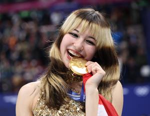 (260220) -- MILAN, 20 febrero, 2026 (Xinhua) -- Imagen del 19 de febrero de 2026 de la medallista de oro Alysa Liu, de Estados Unidos, mordiendo su medalla durante la ceremonia de premiación de la competencia de patinaje individual femenino de patinaje artístico en los Juegos Olímpicos de Invierno Milán-Cortina 2026, en Milán, Italia. (Xinhua/Li Ming) (jg) (da) (vf)
