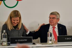(260222) -- MILAN, 22 febrero, 2026 (Xinhua) -- La presidenta del Comité Olímpico Internacional (COI), Kirsty Coventry (i) y el expresidente del COI Thomas Bach, asisten a una sesión del COI en los Juegos Olímpicos de Invierno Milán-Cortina 2026, en Milán, Italia, el 22 de febrero de 2026. (Xinhua/Luca Bruno/Pool) (rtg) (da)