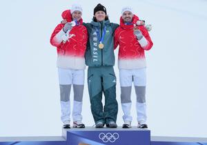 (260212) — LIVIGNO, 12 febrero, 2026 (Xinhua) — El medallista de oro, Cooper Woods, de Australia, reacciona durante la ceremonia de premiación de moguls masculino de esquí acrobático en los Juegos Olímpicos de Invierno Milán-Cortina 2026, en Livigno, Italia, el 12 de febrero de 2026. (Xinhua/Wang Peng) (jg) (ah) (vf)