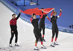 (260217) — MILAN, 17 febrero, 2026 (Xinhua) — Liu Hanbin, Wu Yu, Li Wenhao, y Ning Zhongyan, de China, festejan al término de la final B de la persecución por equipos masculino de patinaje de velocidad entre China y Países Bajos, en los Juegos Olímpicos de Invierno Milán-Cortina 2026, en Milán, Italia, el 17 de febrero de 2026. (Xinhua/Wu Wei) (oa) (ah) (vf)